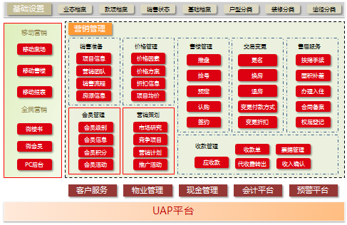 營銷管理、客服管理、基礎(chǔ)物業(yè)管理、商業(yè)運(yùn)營管理等基礎(chǔ)業(yè)務(wù)管